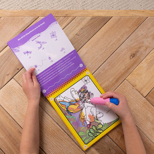 No-mess painting for kids! This exciting paint-with-water coloring book includes four reusable pages and a refillable water pen. Simply use the pen to color in each scene—details and vibrant color appear with every stroke!