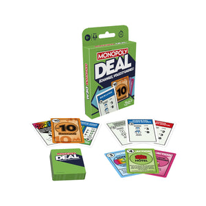 Swap, steal, and scheme with the Monopoly Deal card game! Be the first player to collect 3 complete Property card sets, each in a different color, to win. This deck includes 110 cards: Property cards, Wild Property cards, Action cards, and Money cards. Wild Property cards help players build Property sets.