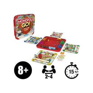 The Monopoly GO! game is what fans love about the popular mobile app game in a social tabletop version! In this thrilling family board game, the first player to build a landmark wins. To get started, each player chooses a mini gameboard with a favorite location, plus a matching-colored die.
