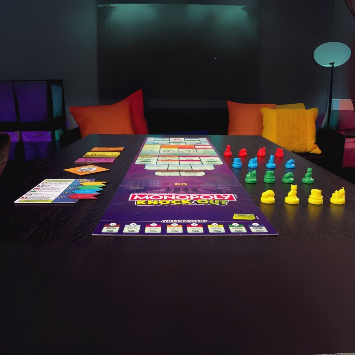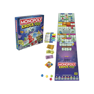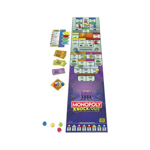 The Monopoly Knockout game is the family party game of sliding tokens and cash-grabbing fun! In this up-and-active version of the Monopoly game, compete against opponents in a token showdown! Players play in rounds, taking turns sliding their tokens down the long gameboard (over 90 cm!) and trying to land them on properties. At the end of each round, they’ll collect – or pay –cash based on where their tokens ended up.