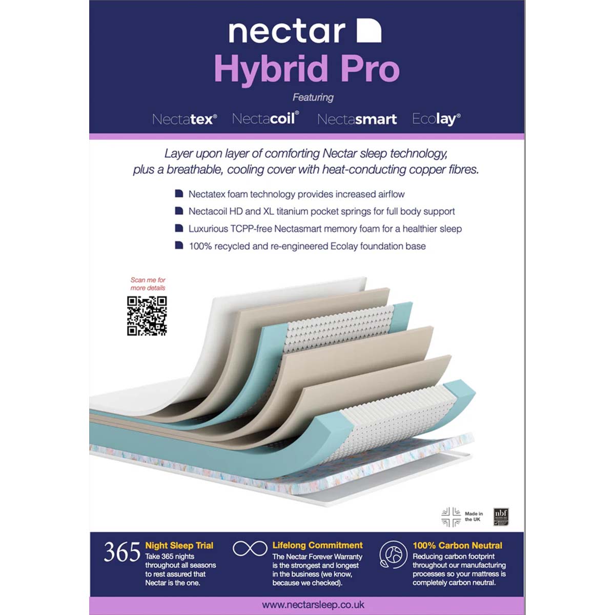 At the heart of the Hybrid Pro lies a harmonious fusion of Nectatex™ cooling fabric and Nectar Smart™ foam, offering adaptive support that intuitively responds to your body’s unique contours. These cutting-edge layers ensure pressure relief, optimal spinal alignment, and a cool, dry sleep environment all night long.