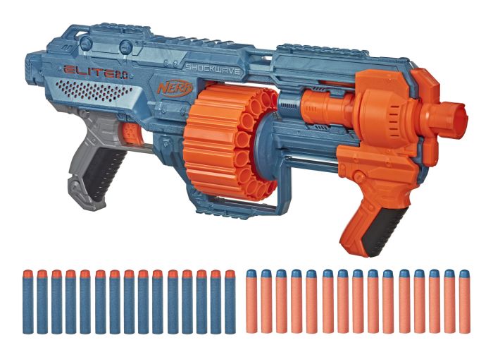 The Nerf Elite 2.0 Shockwave RD-15 blaster features customizing capabilities that include 3 tactical rails, barrel attachment point, and stock attachment point to optimize for battle. This pump-action blaster has a 15-dart rotating drum to swamp your targets. Pull the priming slide back and press the trigger to unleash 1 dart. You can fire 15 darts in a row before it's time to reload. Includes 30 Official Nerf darts - 15 for the drum, and 15 for reloads. Eyewear recommended. Barrel extension, stock, and eyewear not included. No batteries required.