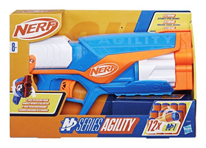 The Nerf N Series Agility dart blaster is built for games in which the action never stops and neither do you! Lightweight, compact, and simple to use, it's a great blaster essential for your Nerf stockpile. The Nerf N Series Agility blaster has a rotating drum with 6-dart capacity, includes 12 Nerf N1 foam darts, and has pull back priming. To play, load darts into the drum, pull back the priming slide, and pull the trigger to fire a dart. Nerf N Series blasters are compatible only with Nerf N Series N1 darts. Eyewear recommended (not included). NERF and HASBRO and all related trademarks and logos are trademarks of Hasbro, Inc. Ages 8 and up TO AVOID EYE INJURY: WARNING: Do not aim at eyes or face. Use of eyewear recommended for players and people within range. Use only official Nerf darts. Other darts may not meet safety standards. Do not modify darts or blaster.
