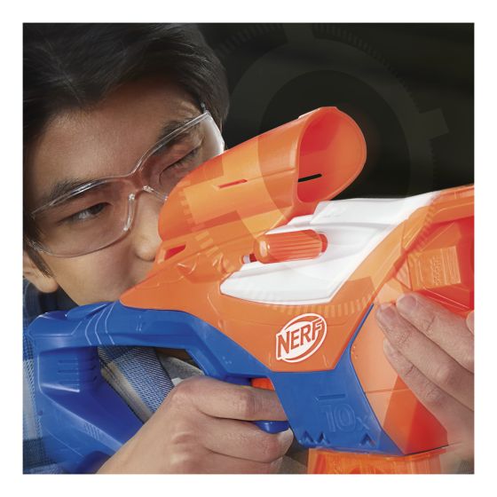 The Nerf N Series Pinpoint dart blaster is built for accuracy with cool styling and features that give you a targeting advantage in Nerf backyard games. The bolt-action blaster has a 10-dart clip and includes 18 Nerf N1 foam darts, giving you enough darts to load the clip fully and additional darts for reloads. To play, load darts into the clip, load the clip into the blaster, move the priming bolt backward and forward, and pull the trigger to fire a dart. Nerf N Series blasters are compatible only with Nerf N1 darts. Eyewear recommended (not included). NERF and HASBRO and all related trademarks and logos are trademarks of Hasbro, Inc Ages 8 and up. TO AVOID EYE INJURY: