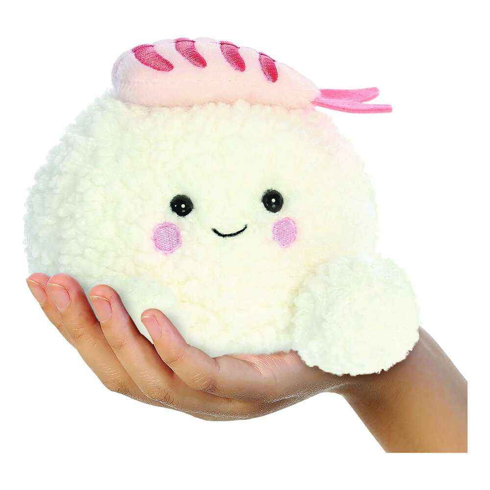 Introducing Ebi Shrimp Sushi, the latest addition to Aurora's most popular Palm Pals Collection. It is a soft and cuddly toy filled with beans that fit perfectly in your hand. fibre fill and beans made from recycled plastic materials. Our hangtags are recyclable with our cloth labels being made from recycled materials.
