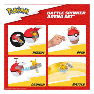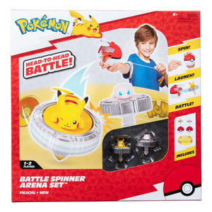 Battle head-to-head with the Pokémon Battle Spinner Arena Set. Set features one Battle Arena, two Battle Spinners with Pikachu and Mew, and two Poké Ball Spinner Launchers. Load the Battle Spinners into the Poké Ball Spinner Launchers and pull back on the winding cord. Then, press the top button on each Poké Ball to launch the battle spinners into the Battle Area and spinning into action. Each spinner features authentic details and looks like it jumped right out of the Pokémon Animated Series. Officially licensed Pokémon product from Jazwares. Ages 4+ Includes: (1) Pikachu Battle Spinner (1) Mew Battle Spinner Figure (2) Poké Ball Spinner Launchers (1) Battle Arena