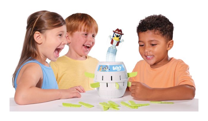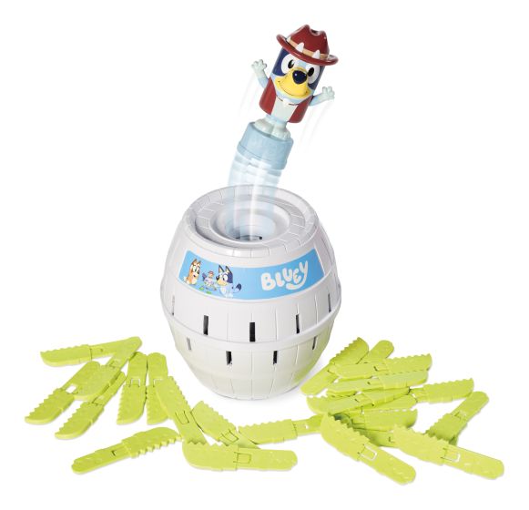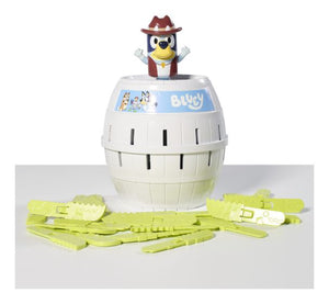 Who'll make Bluey pop from the top of the barrel? In this new version of the classic children's game, you have just one aim - don't make Bluey jump! Up to four of you slide crocodile swords into the barrel annnnnd - Oh, Biscuits!