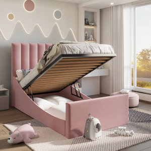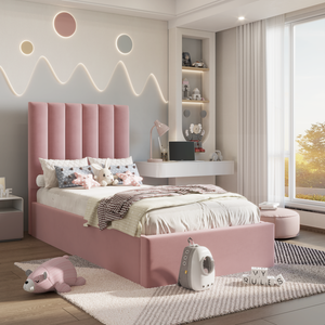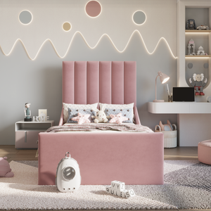 The Prestige Lined Kids Bed is the optimal option for an elegant and cosy sleeping area. Available in 12 velvet fabric colours, this bed frame is handmade with a sturdy internal frame and a wooden slatted base. Furthermore, the option to upgrade to an ottoman storage bed for extra storage exists. There is option to choose safety side rails. This bed is designed with comfort, practicality, and safety in mind. It is the perfect choice for busy households and children's bedrooms, offering smooth edges, quality construction, and the versatility to meet all your needs.