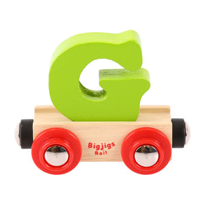 Bigjigs Rail Name carriages are loaded with a brightly coloured wooden letter or number. Each letter or number is removable and can be interchanged with other wagons and carriages in your wooden train set.