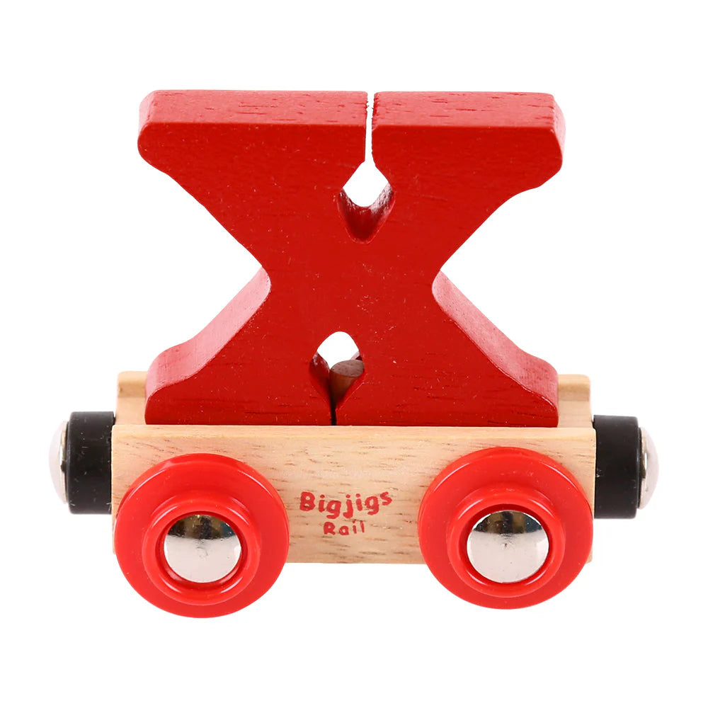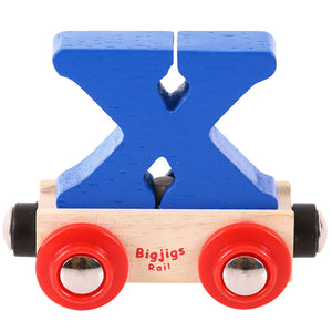 Bigjigs Rail Name carriages are loaded with a brightly coloured wooden letter or number. Each letter or number is removable and can be interchanged with other wagons and carriages in your wooden train set.