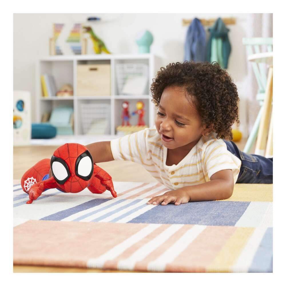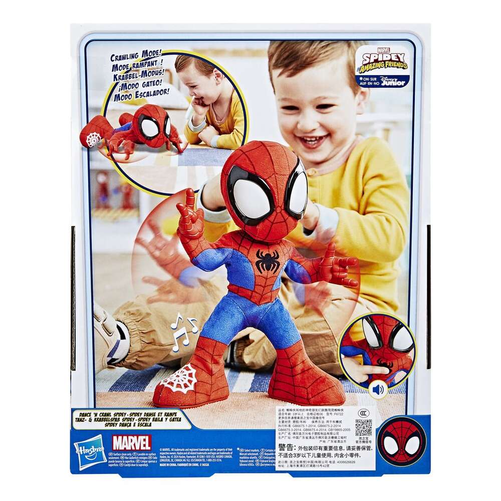 Get ready for dancing, crawling, and webtastic sound effects with the Marvel Spidey and His Amazing Friends Dance 'N Crawl Spidey! Preschool boys and girls 3 and up can activate dance mode by pushing the web on Spidey's foot. Press the icon on Spidey's chest and hear 5 awesome sound effects, plus 2 instrumental songs for dancing along! Ready for pretend wall-crawling action? Watch Spidey crawl by tilting his head up, rotating his wrists, and placing him on his belly. Phew, what an adventure! Settle down for a story or a nap with Spidey. Plush Spidey toy is covered in a soft fabric that's perfect for snuggling when playtime is done. This Spidey and His Amazing Friends toy makes a great Marvel gift for boys and girls and helps to encourage movement while imagining awesome adventures with Spidey. Copyright MARVEL. All trademarks and registered trademarks are the property of their respective owners. HASBRO and all related trademarks and logos are trademarks of Hasbro, Inc. Ages 3 and up. WARNING: Small parts may be generated. Battery info: 1.5V AA x4 included.
