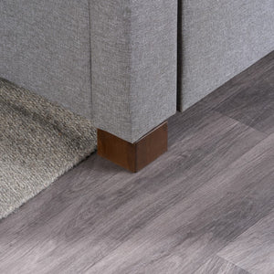 Upholstered in a beautiful soft grey fabric, this low-based bed features a detailed deep-buttoned headboard.