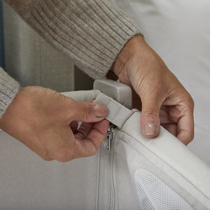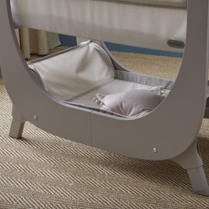 Dual mesh sides with a larger outer mesh offers maximum airflow and the supportive, breathable mattress helps regulate baby's temperature. The ‘whisper quiet’ drop-down side is quick and easy to use without disturbing baby and the rigid low-level option has been designed for safe bedside sleeping in line with the latest crib safety standard BS EN 1130:2019. An incline option helps ease colic and reflux and the storage hammock holds all those feeding and changing essentials.