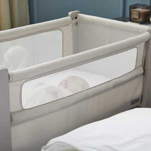 Rigid low level safety wall allowing the side to remain lowered and dual mesh panels to keep a watchful eye on baby.