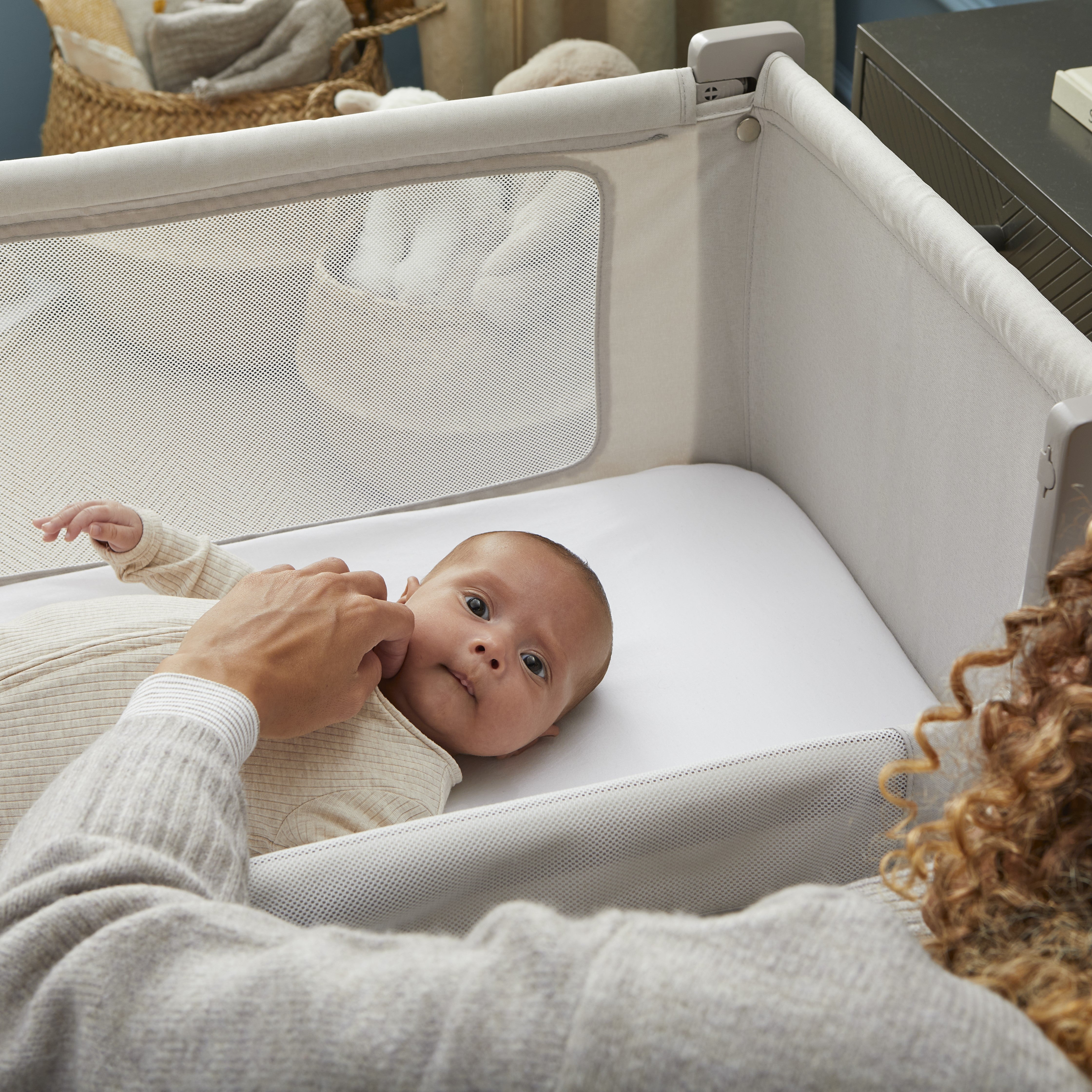 Tested to latest bedside crib safety standard and designed for maximum airflow and breathability.