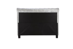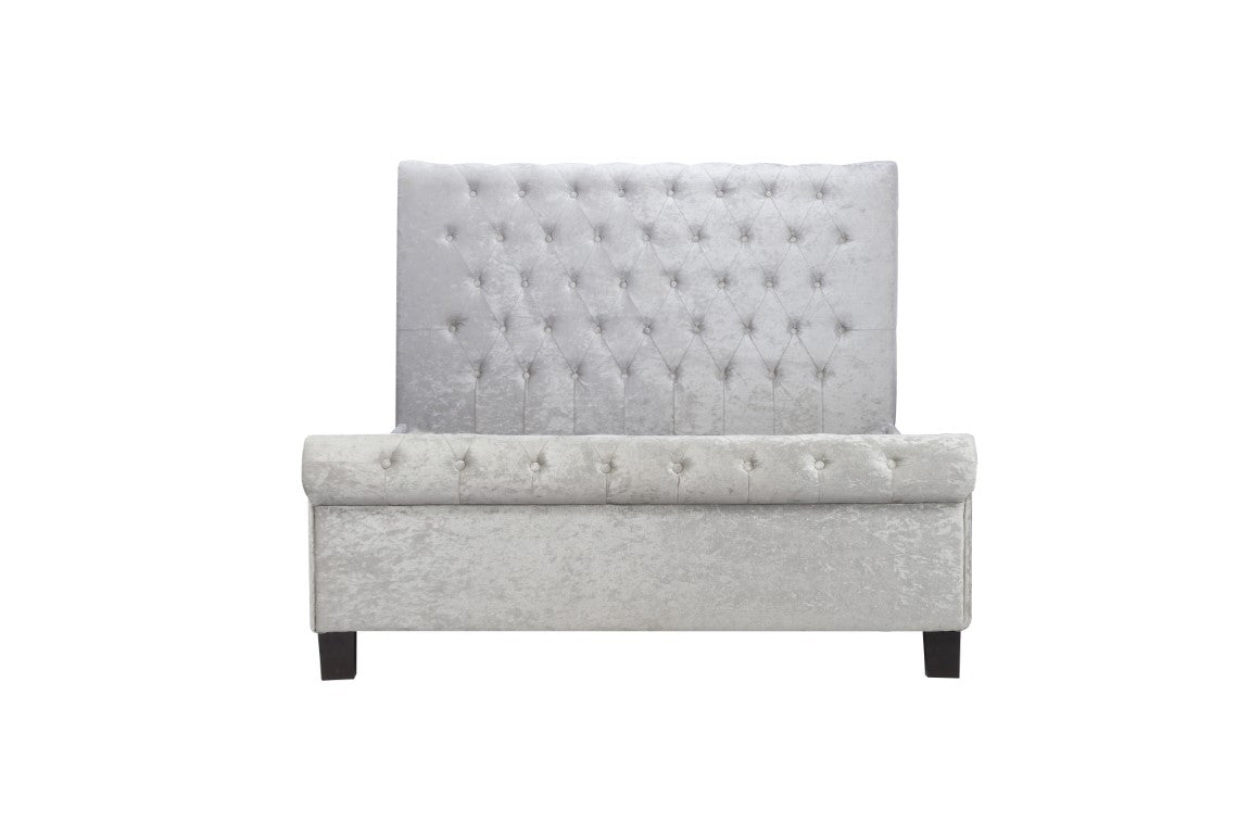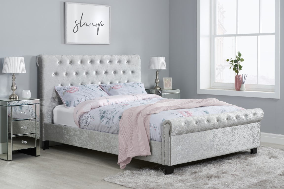 The Sienna bed frame is upholstered in polyester with complementary dark feet and comes in a beautiful crushed steel velvet.