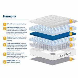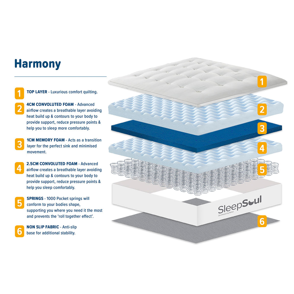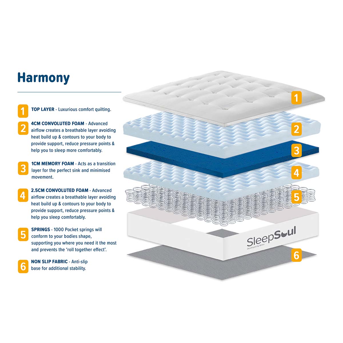 Featuring 4cm of convoluted foam, 1cm of memory foam and another 2.5cm of convoluted foam, the SleepSoul Harmony mattress has to be felt to be believed. The convoluted foam is a breathable layer that provides advanced airflow for a cooler night's sleep. It also reduces pressure off joints and muscles.