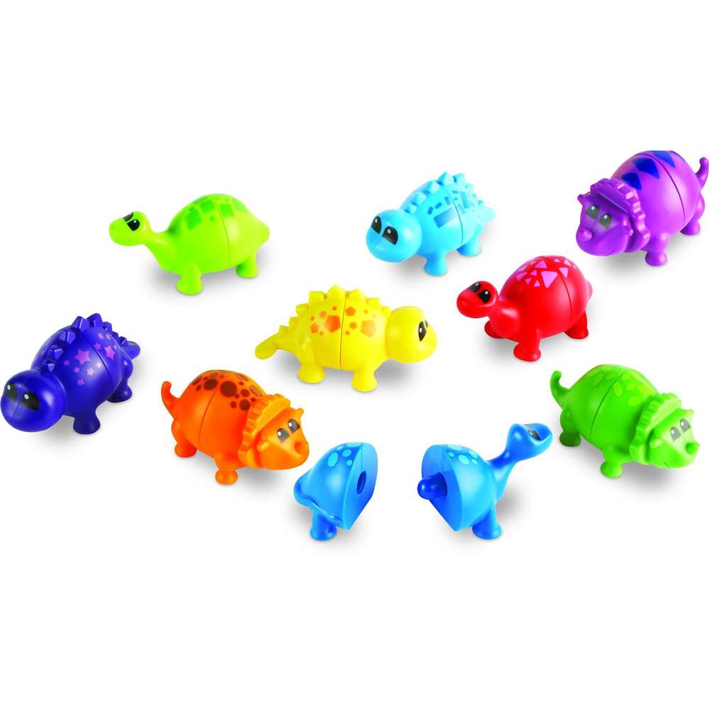 Learning Resources Snap-n-Learn Matching Dinos. Match colours and shapes with these friendly Snap-n-Learn Matching Dinos! Children develop their fine motor skills and build their early number and counting skills as they piece together the colourful dinosaurs. Each dino is marked with a unique shape on it’s head and back, encouraging young learners to find the two that match together. They can also use the colours to help them match too! Set includes ten two-piece plastic dinos. Largest dino measures 12cm L x 7cm H. Includes useful storage tub. Suitable for ages 2+
