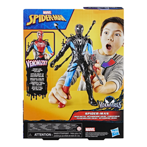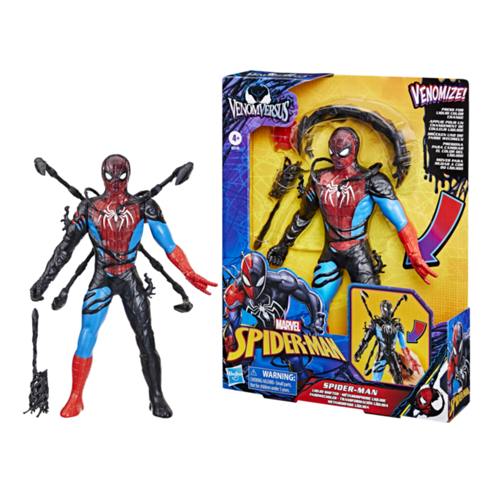 Imagine alien symbiote-powered action and adventure with Marvel Spider-Man VenomVersus toys! This cool Spider-Man Liquid Shifter action figure stands 11-inches tall (27 cm) and features Venomized Spider-Man suit design and deco, inspired by the Marvel comics. Attach the 6 Venom-inspired accessories to the Spidey toy to begin the symbiote transformation. Then press figure’s arm to activate the liquid-shift feature and watch as black liquid Venomizes Spider-Man! Once released, the black liquid will recede, and the figure will transform back into Spider-Man. Look for more Marvel Spider-Man VenomVersus toys for boys and girls to build an awesome web slinger collection, trade with friends, or give as Marvel gifts! (Each sold separately. Subject to availability.) Copyright MARVEL. All trademarks and registered trademarks are the property of their respective owners. HASBRO and all related trademarks and logos are trademarks of Hasbro, Inc. Includes: Figure and 6 accessories. Figure scale: 11 inches (27cm) Ages 4 and up. WARNING: Small parts may be generated. Not for children under 3 years. © 2025 MARVEL. © 2025 Hasbro. All rights reserved.