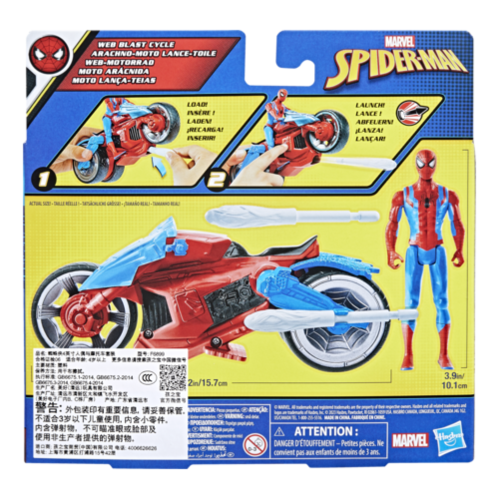 Children aged 4 and up will love imagining Spider-Man zipping through the streets while taking down the bad guys with this Marvel Spider-Man Web Blast Cycle! Children can step into the world of Spider-Man for amazing web-slinging action and adventures. This Spider-Man playset includes a 10-cm-scale action figure, a toy motorcycle, and two web blast projectiles so children can sling imaginary webs and become a hero. With multiple points of articulation, children can pose the figure and imagine themselves in battle. This toy vehicle playset has everything children need for pretend superhero play inspired by the Marvel Universe! Copyright 2022 MARVEL.  Hasbro and all related terms are trademarks of Hasbro.