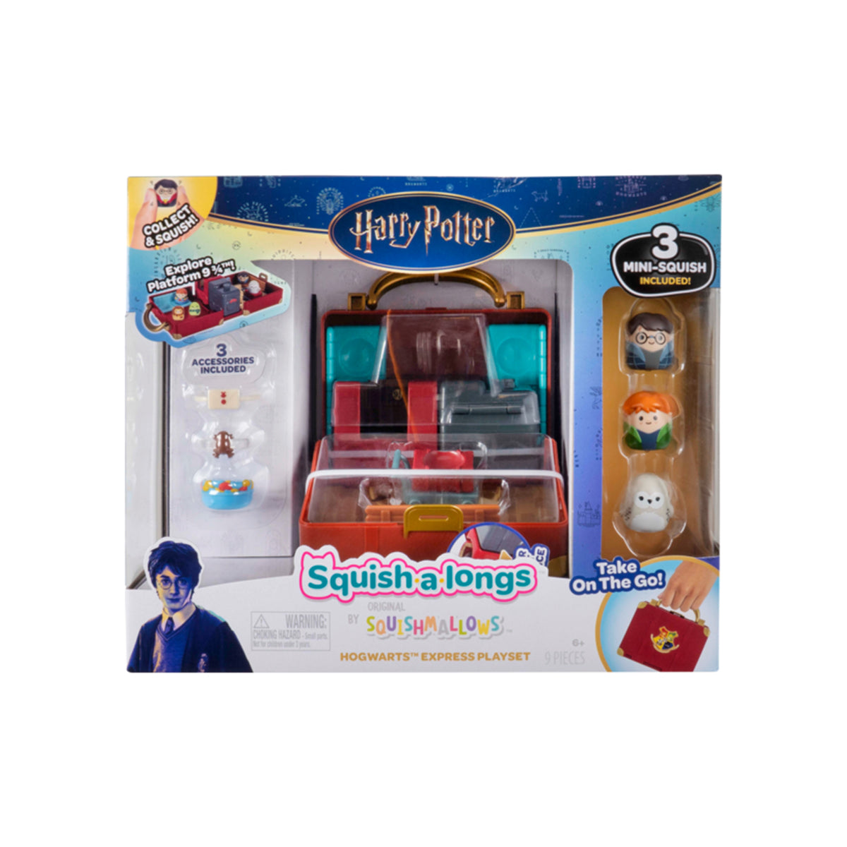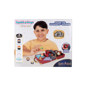 Inspired by the iconic journey from the Muggle World to the Wizarding World, this official Harry Potter Squish-a-longs playset includes Mini-Squish Harry Potter, Ron Weasley, and Hedwig the Owl to play with or display at King's Cross Station, on the Hogwarts Express, or spinning through Platform 9 3/4. Features unique accessories like a Chocolate Frog clip-on, closes into a portable Hogwarts School Trunk, and fits up to 5 Mini-Squish to take on the go. Bring home the magic with Harry Potter Squish-a-longs and join the Squad today!