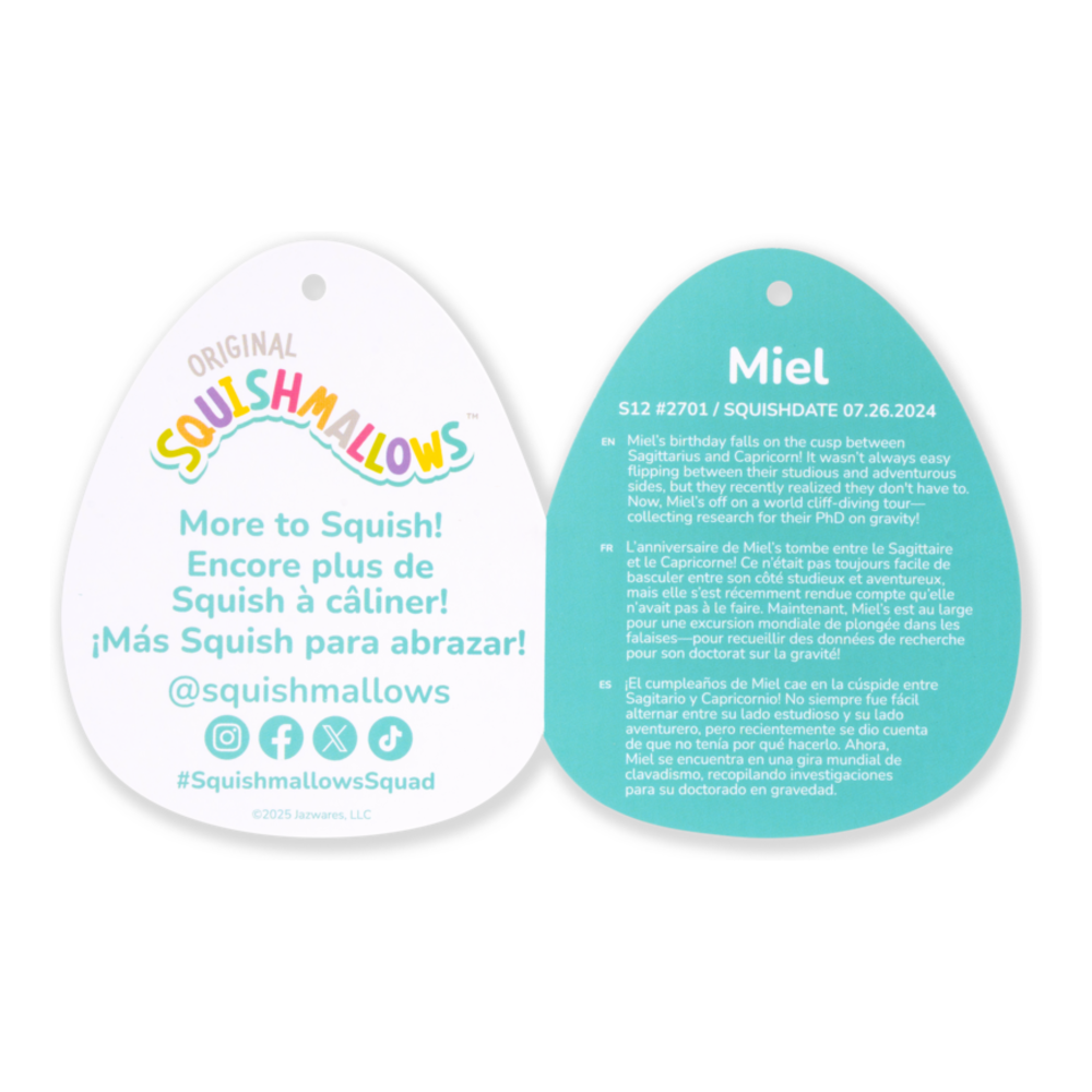 Miel’s birthday falls on the cusp between Sagittarius and Capricorn! It wasn’t always easy flipping between their studious and adventurous sides, but they recently realised they don't have to. Now, Miel’s off on a world cliff-diving tour—collecting research for their PhD on gravity! Meet your new bestie, Miel! Each Squishmallow plush comes with its own unique name and bio and makes the perfect cuddly companion for comfy nights in or long flights out. Miel is only by Original Squishmallows. Join the Squad today!
