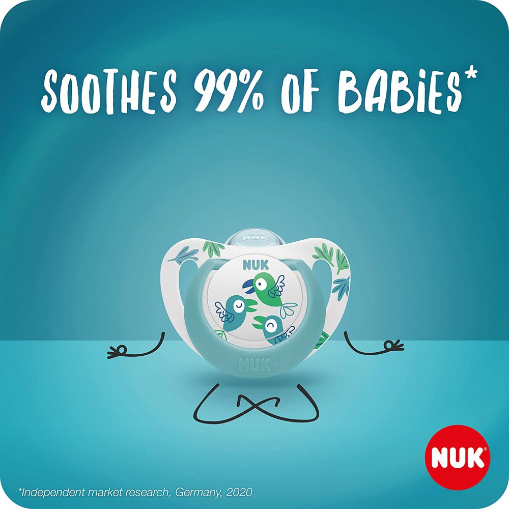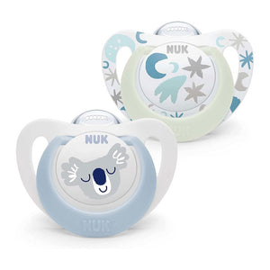 NUK Star Day & Night Soothers, 0-6 Months. Isn’t it great when there’s something you can always rely on? The NUK Star soother is just that. 99% of babies are soothed by it*. 96% of breastfeeding mothers appreciate that it’s breastfeeding-friendly*. And more than 90% of orthodontists recommend it because of its jaw-friendly shape.* Unfortunately, babies can’t explain why they love their NUK Star so much. But we suspect it’s because of the pleasant feeling in their mouths: the special soft zone on the upper side nestles very gently against the palate, while the underside of the NUK Star leaves room for the tongue’s natural sucking movements. And because it’s very narrow and flat, hardly any pressure is exerted on the teeth or jaws. NUK Star Night Soothers help babies to find their way easily to the Land of Dreams. Thanks to a baby-safe luminous material, the soothers radiate a soft glow in the dark and can be found quickly and easily even at night.