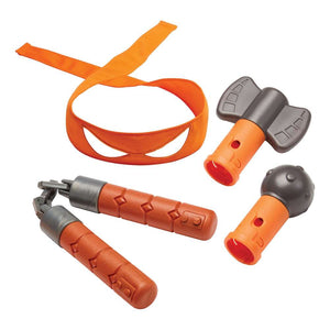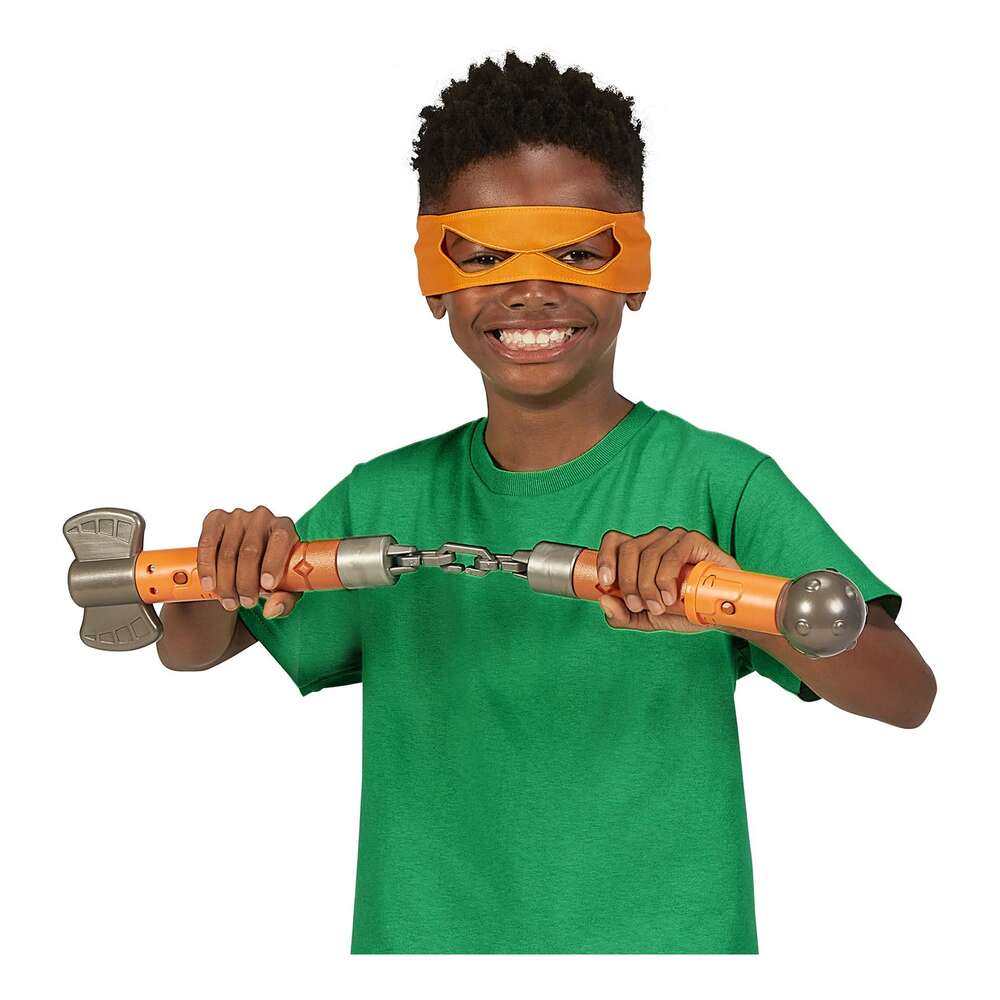 Become the comedic Michelangelo from the hit Teenage Mutant Ninja Turtles Mutant Mayhem movie with Michelangelo's Ninja Reveal Role Play set! Tie on Mikey's bright orange bandana, grab his powerful nunchaku and throwing star and, in an instant, you've become Michelangelo! When the baddies attack, unleash the power of Mikey's nunchaku with the press of a button and a twist of the wrist and pull the handles apart—now you’re ready for the fight! When the battle’s won, simply drop the chain into the handle, twist to conceal it, and you’re ready for the next fight!