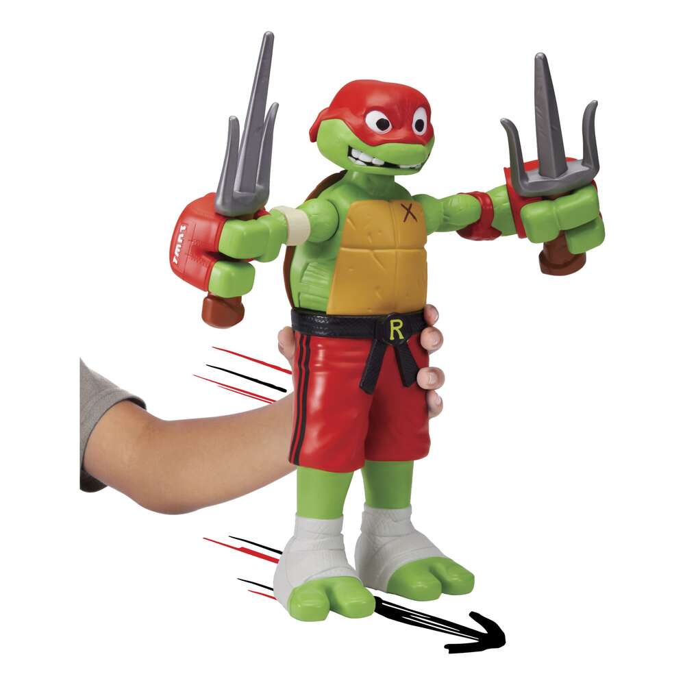 When a fearsome new foe arrives in New York City, it's up to the Turtles to defend the city's streets (and the sewers). To begin the battle, roll Raph on a hard surface and watch as he unleashes powerful punching action! Robots don't stand a chance against massive mutant punches!