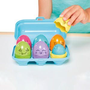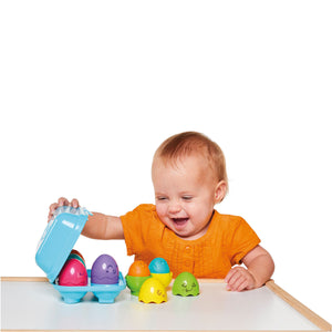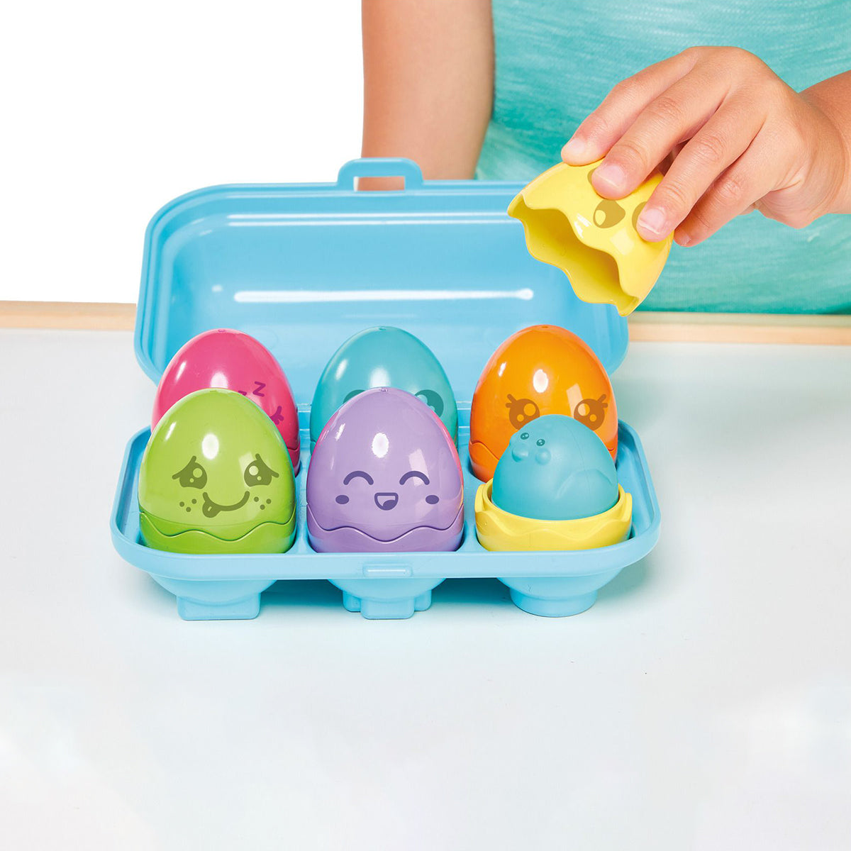 From six months on, babies will love to engage with these colourful, funny-faced eggs. They’ll also discover the brightly coloured chicks hiding inside the shells, with three that go cheep-cheep when they push down, and three that now rattle when they’re shaken. As children grow older, they’ll discover how the top half of the shells fit with the lower half, then start naming the colours and matching their funny colourful faces to the chicks inside.