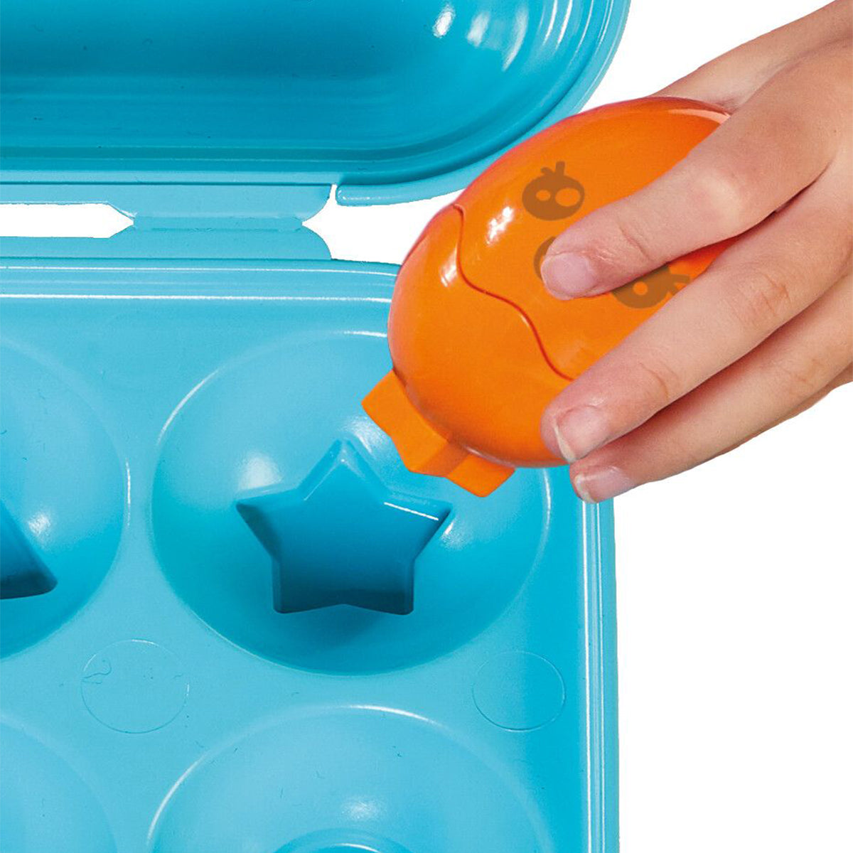 Mix them up again in an infinite number of combinations. Learn the egg colours and then guess which colour will be hidden inside. There’s also shape sorting fun as each base fit in its own unique slot in the bottom of the egg box. There are round pegs, square holes, triangles, stars and more to discover and remember.