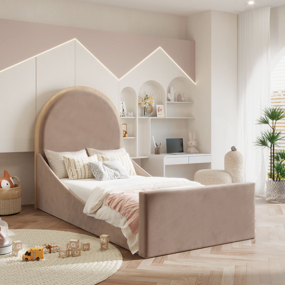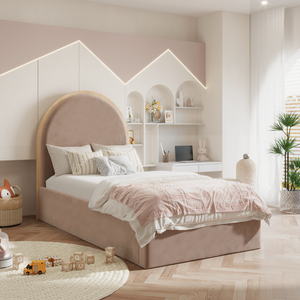 The WoodyWinks Kids Bed offers a warm and inviting sleep space with its gently curved headboard and soft, neutral upholstery. This charming bed provides a secure and comfortable environment for your child to rest and dream, blending seamlessly with various bedroom themes and promoting a sense of calm.