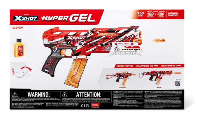 The X-Shot Hyper Gel Clutch can blast Hyper Gel Pellets at 150 feet per second. The Clutch has a 100 Pellet capacity hopper and an additional 400 capacity mag. Stocked with 5,000 Hyper Gel Pellets and protective eyewear, just add water to start the ultimate Gel Blaster battle!