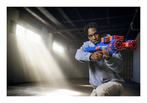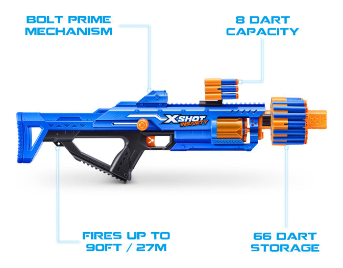 Insane combos, ammo and action with X-Shot Insanity! The X-Shot Insanity Berzerko packs enough power to take on targets 27m / 90 feet away! This blaster blows away the competition with a rapid-fire of 8 darts in seconds using the rotating barrel, plus an insane amount of dart storage to hold an additional 66 darts to keep you locked and loaded in battle.