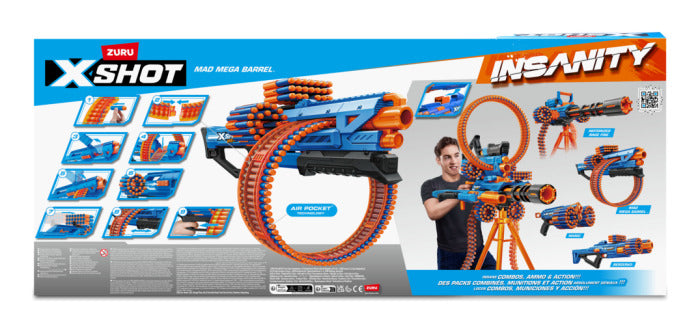 Insane combos, ammo and action with X-Shot Insanity! Load up the Mad Mega Barrels 72-dart capacity barrel to take out multiple targets from up to 30m / 98 feet away! It comes with 3 modular dart storage units to hold an additional 66 darts!