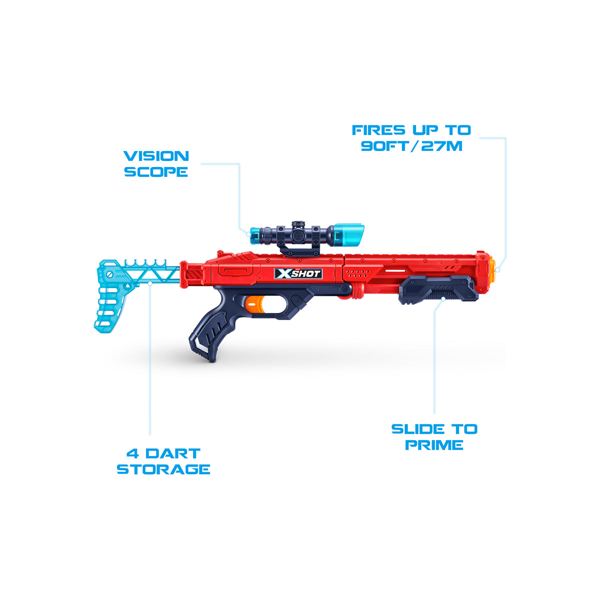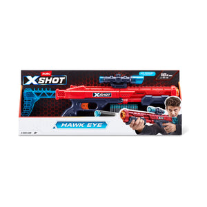 Exercise precision vision with the X-Shot Excel Hawk Eye! This blaster takes target practice to the next level. Use the detachable scope and pump-action mechanism to shoot with accuracy from up to 27m / 90 feet away! The tactile grip handle stabilises your shot so you can fire with precision while the extra dart storage ensures you’re always ready to fire your next round. Never miss a chance to strike with the X-Shot Hawk Eye.