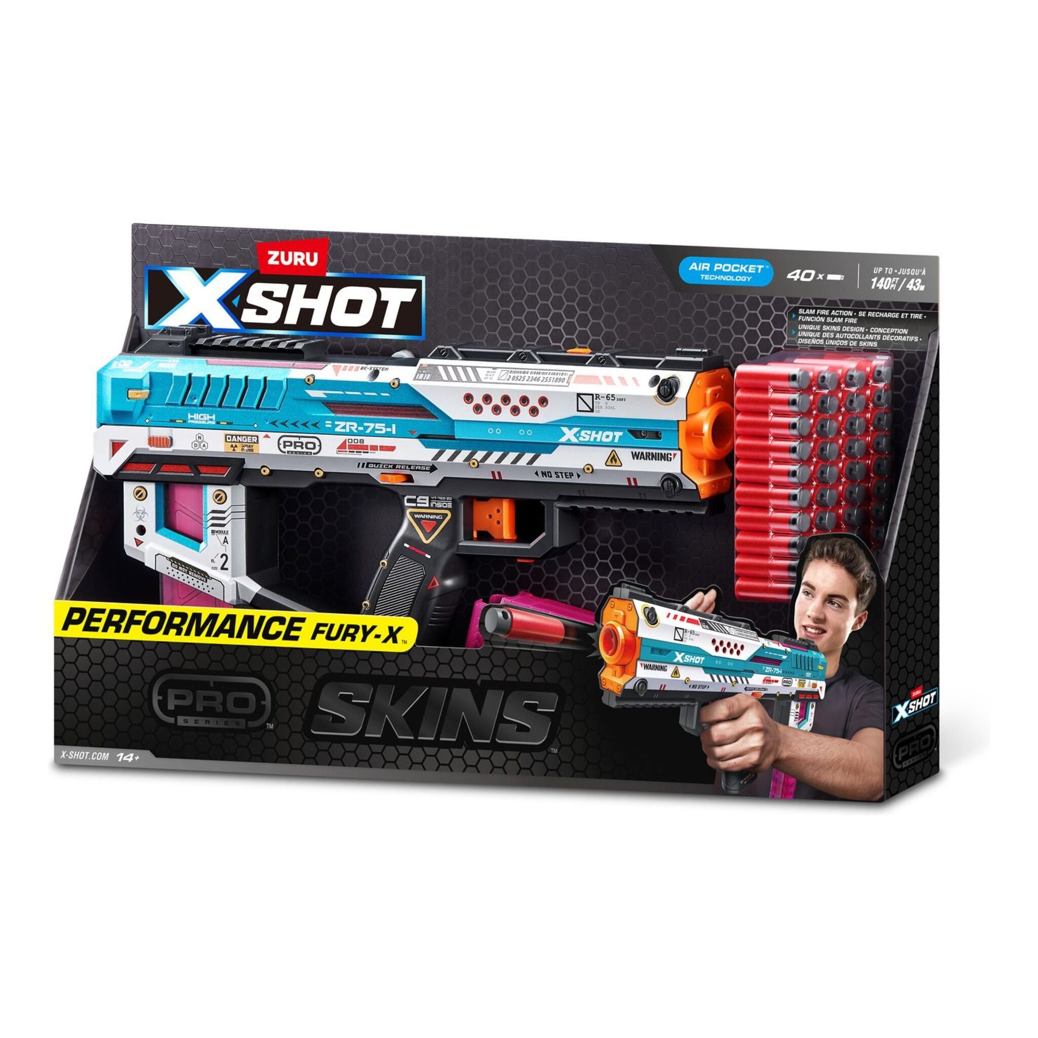 Take your dart blasting to the NEXT LEVEL with the XSHOT SKINS Pro Series Fury-X Blaster. The Fury-X is designed to achieve accuracy and distance in every blast. Equipped with a quick release 20 half dart capacity clip, your blaster battles have just gone pro! Includes 40 XSHOT Air Pocket Technology half darts for a further, faster and more stable flight. Featuring Slam Fire Action to blast through the 20 dart clip in seconds and take out targets up to 43m / 140 feet away! Go NEXT LEVEL with XSHOT Pro Series.